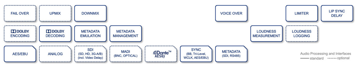 Voice over functionality is provided allowing for seamless integration of voice and program content with automatic ducking or mixing. Optional features offered through software licenses are Upmix to create 5.1 surround from native stereo audio, and Fail Over to facilitate automatic switching to a back up signal feed or bitstream should the primary feed be lost. True peak limiting is included as a standard feature.