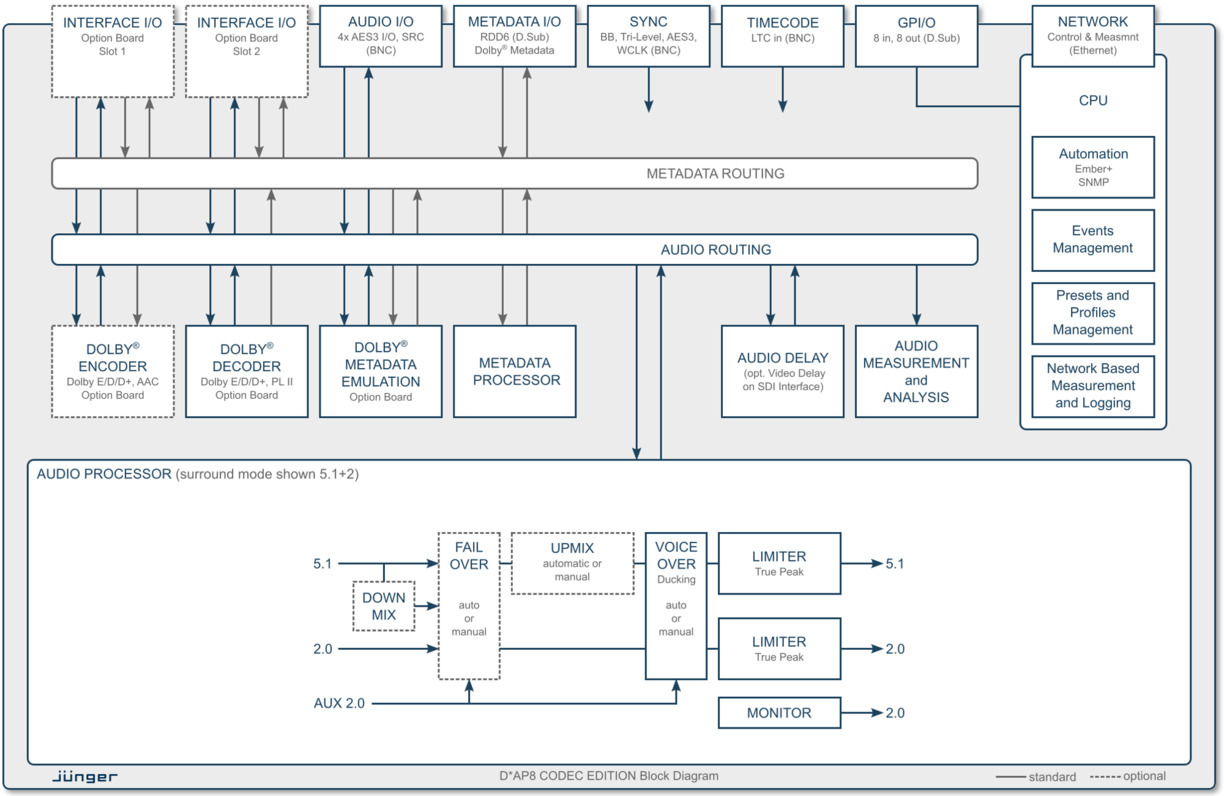 Designed for use in all areas of audio broadcast and distribution, Jünger Audio’s D*AP8 CODEC offers the functionality to decode and/or encode any current Dolby® audio bitstream and to effectively manage and emulate all Metadata parameters.